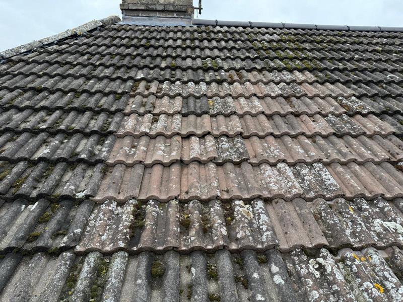 Before: The initial images clearly show a roof in need of urgent attention. The tiles were covered in moss and lichen, and several were visibly damaged or had slipped out of place, leaving the roof vulnerable to leaks. The lead flashing around the chimney was failing, and the underlying felt and battens showed signs of decay, highlighting the need for a comprehensive repair.